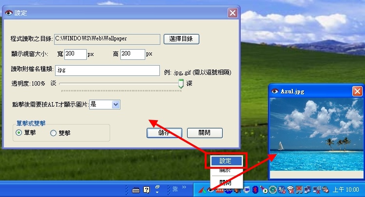 1. 您可設定顯示視窗之大小及圖片的透明度。